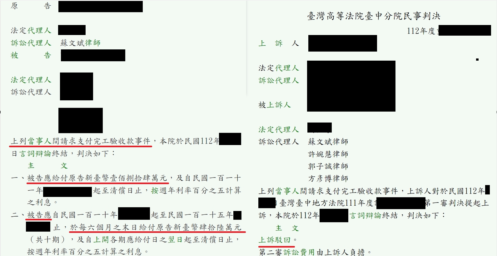 完成工程卻拿不到錢的乙公司便來到我在法律事務所請求協助,經蘇文斌律師細究雙方合約內容,及種種事證,便對甲公司之抗辯提出有力的反駁,