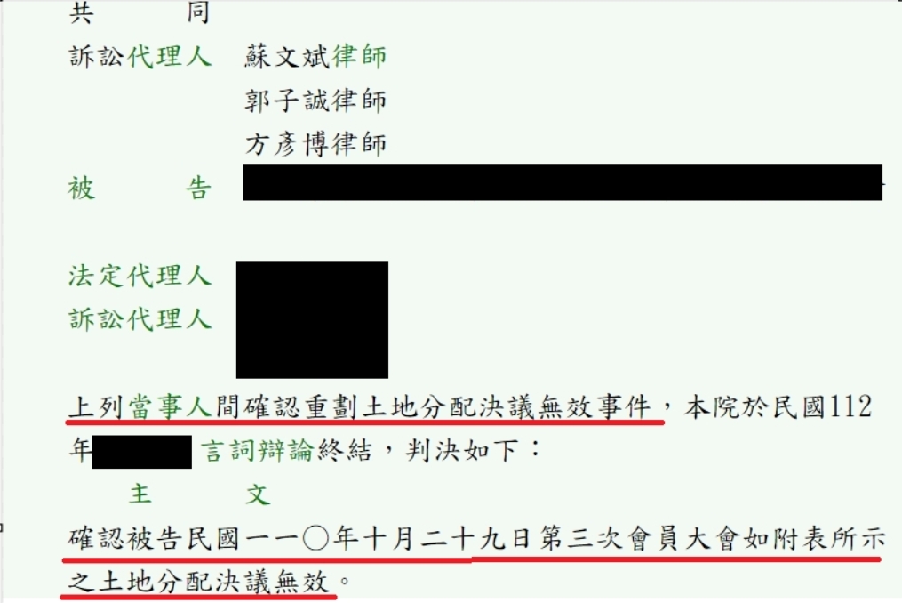 該案中,重劃會之會員大會決議沒有按照市地重劃辦法第31條原次位分配及逐宗個別分配原則進行分配,該決議顯屬無效,我方提出相關規範及事證,進而證明該決議違反市地重劃辦法而無效,最後法院亦細究決議內容後,同意我方聲明,認定重劃會之會員大會決議確實違反原次位分配及逐宗個別分配原則,而屬無效。