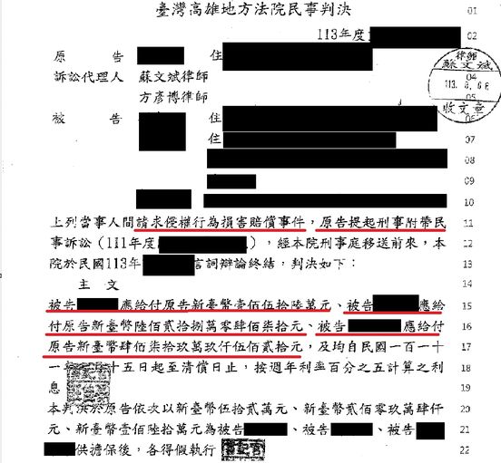 而除了刑事部分提起詐欺告訴、並且讓這些詐騙集團的車手一一被論罪科刑外,最重要就是民事賠償的請求。而本案蘇文斌律師團隊(我在法律事務所)也替當事人提起刑事附帶民事訴訟,請求詐騙集團的成員將款項返還,最終法院採信了蘇文斌律師團隊(我在法律事務所)的主張,判決這些成員應該將詐騙款項歸還。