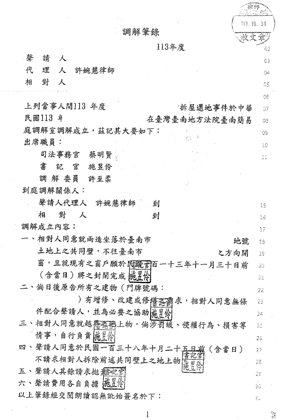 但經蘇文斌律師團隊(我在法律事務所)向鄰居說明法律關係後,鄰居亦理解其有占用我方當事人之土地範圍,故而雙方多次進行協商。我方當事人為求鄰里關係和諧,決定有條件與鄰居和解。經蘇文斌律師團隊(我在法律事務所)保證當事人利益之前提下,協助擬定內容,最終雙方都獲得滿意之結果。