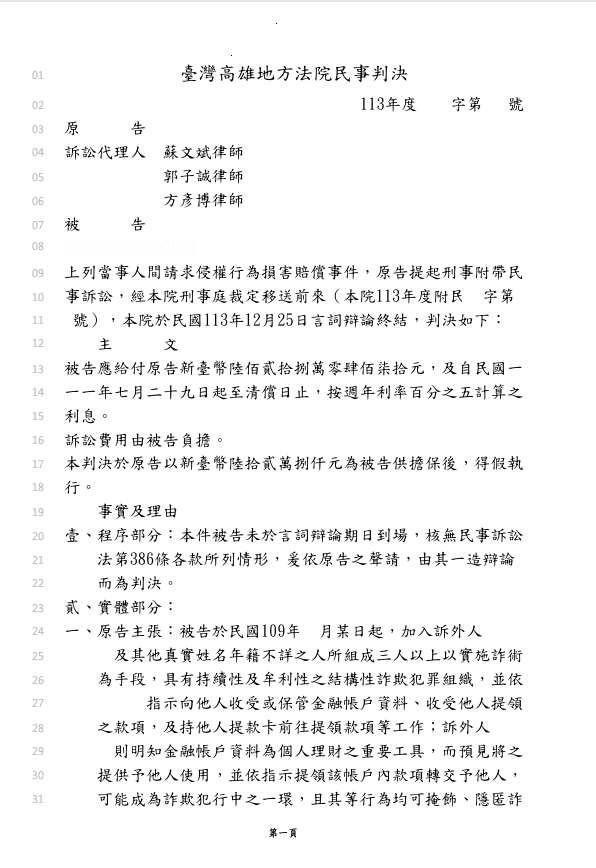而除了蘇文斌律師團隊(我在法律事務所)刑事部分提起詐欺告訴、並且讓這些詐騙集團的車手一一被求處重刑外,也協助當事人提起刑事附帶民事訴訟,法院依照蘇文斌律師團隊(我在法律事務所)的主張,判決這些成員應該將詐騙款項歸還。