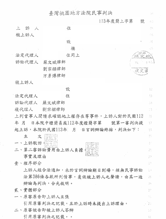 從第一審到二審的全面勝訴,蘇文斌律師團隊(我在法律事務所)再次確保了當事人的土地權益。