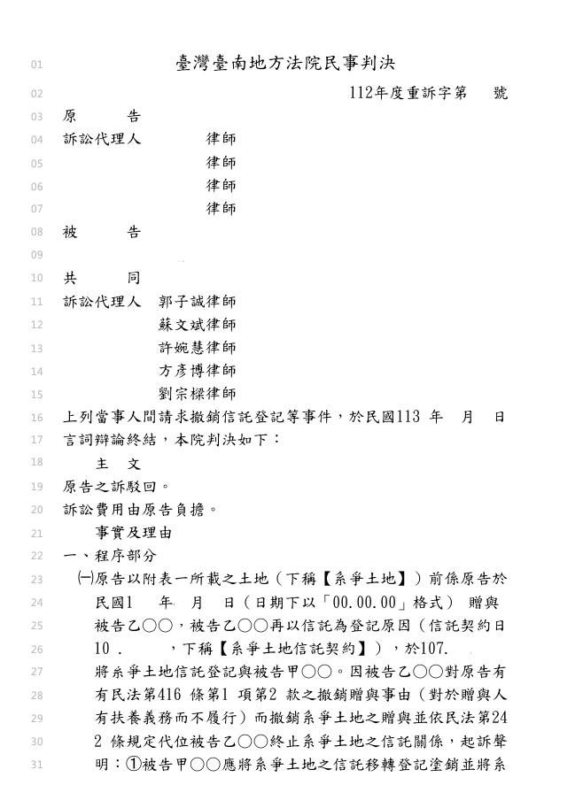 早先就有當事人a先生前來蘇文斌律師團隊(我在法律事務所)諮詢,稱其父親曾贈與其土地,a先生並將土地信託給其母親。嗣後,其父自稱經濟狀況不佳,欲請求扶養費,但a先生知其父親尚有餘裕而並未給付之,其父親便一狀告上法院,要求撤銷贈與,並請求塗銷信託登記以回復之。
