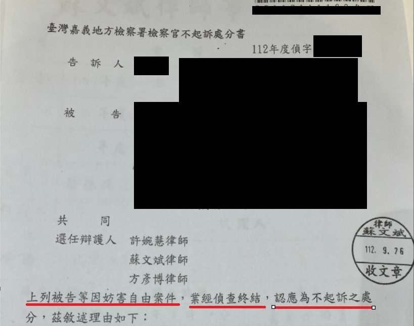 深怕因此有了前科的甲男與乙女來到了我在法律事務所,請求蘇文斌律師團隊的協助,經本所律師團隊縝密地細究事證,剖析母子倆案發當天到底講了什麼、語句上下文為何、整起紛爭的脈絡為何,而向檢察官主張,兩人當天所言僅因一時衝動,絕無想具體加害被害人之意,最後亦被檢察官採納,幸獲不起訴處分。