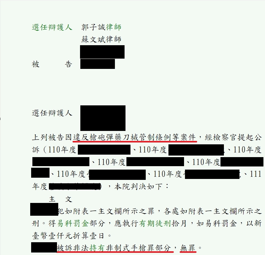 前陣子蘇文斌律師(我在法律事務所)受一當事人委託(下稱甲男),表示其突遭檢方起訴涉犯傷害、恐嚇、非法持有槍械等罪,甲男稱許多律師告訴他關於槍砲的部分沒就,透過朋友介紹來找刑事案件極富盛名的蘇文斌律師,蘇文斌律師團隊討論、研究卷證後發現,非法持有槍械部分並非毫無空間,因此著手為甲男擬定辯護策略。