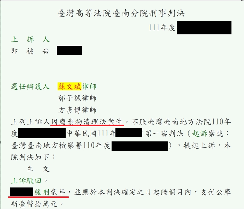 例如以下本所承辦之案例,當事人因違法傾倒廢棄物被檢察官起訴後,一審並未委聘律師辯護,結果遭法院判處有期徒刑一年四個月。經其上訴後前來委聘本所蘇文斌律師,本所於案件進行過程中評估該案件之具體狀況後,建議當事人採認罪協商方式,並提供處理合法廢棄物清運流程,協助當事人向法院爭取緩刑宣告,最終獲取法院判決緩刑二年,免去當事人的牢獄之災。