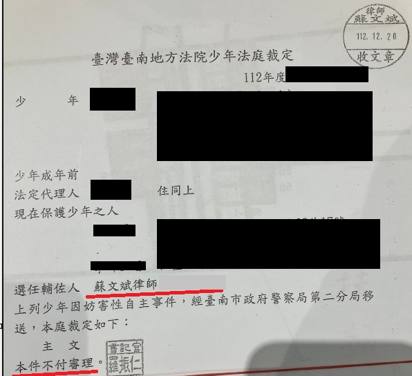 而我們團隊在仔細比對了女方的說法,以及卷內的證據以後,發現不只女方的說法有諸多矛盾之處,也沒有任何證據可以佐證,女方單純是因為感情問題,出於報復才提起告訴。最終,少年法庭採納了我們團隊的說法,並最終做成了不付審理的裁定,還該少年一個清白。