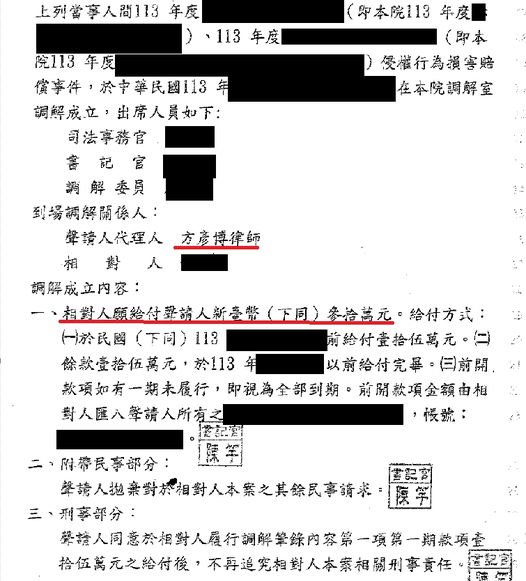 當時案件已經在法院繫屬審理中,但除了希望加害人受到懲罰,當事人也希望取得一定的賠償。為此,蘇文斌律師團隊(我在法律事務所)經過了漫長的調解及談判,總算是替當事人爭取到了賠償,並且幫當事人與對方達成和解,以儘速替當事人彌補損失。
