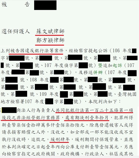復觀本件偵查案號眾多,案件規模甚大,犯罪所得高達一億元以上,因此有刑度加重為七年以上之規定,當事人被起訴後,面臨可能的牢獄之災,極為忐忑。於是在朋友推薦下,前來尋求刑事辯護及銀行法非常有經驗的蘇文斌律師團隊(我在法律事務所)協助。
