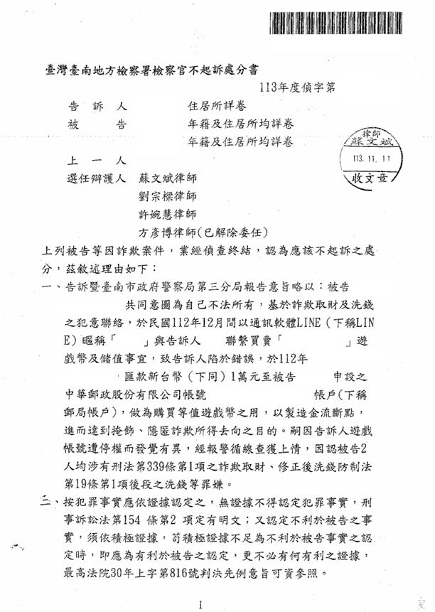 當事人來事務所稱其遊玩線上遊戲,卻莫名遭他人提告詐欺,因此尋求蘇文斌律師團隊(我在法律事務所)協助,然而經蘇文斌律師團隊(我在法律事務所)詳細詢問案情後得知,當事人利用遊戲系統交易遊戲貨幣,銀貨兩訖,實無詐欺之情,因此在蘇文斌律師團隊(我在法律事務所)了解來龍去脈後,便立刻陪同當事人到案說明,最後檢察官也釐清事實,給予不起訴處分。