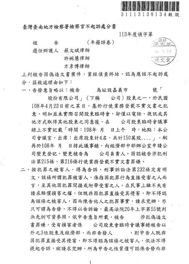 蘇文斌律師團隊(我在法律事務所)向檢察官分析法律問題,主張本件只是程序理解不足的問題,並不是刑法領域該處理的事。過程中也多次與當時開會的股東面談,並確認當初的狀況,也向檢察官說明有這些股東可以作為證人傳喚。幸而檢察官接受了蘇文斌律師團隊(我在法律事務所)的說法,最終決定不起訴。