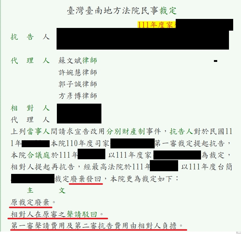 為此,這位父親找上了蘇文斌律師團隊(我在法律事務所),希望委託我們解決這個糾紛。而我們團隊在瞭解事件的來龍去脈以後,也向法院詳細說明了兩造家庭的真實狀況,雖然一審法院裁定妻子勝訴,宣告改用分別財產制,但在我們團隊的不懈努力下,二審逆轉了原先的裁定,法院最終駁回妻子的請求,我們成功替當事人爭取了勝利。