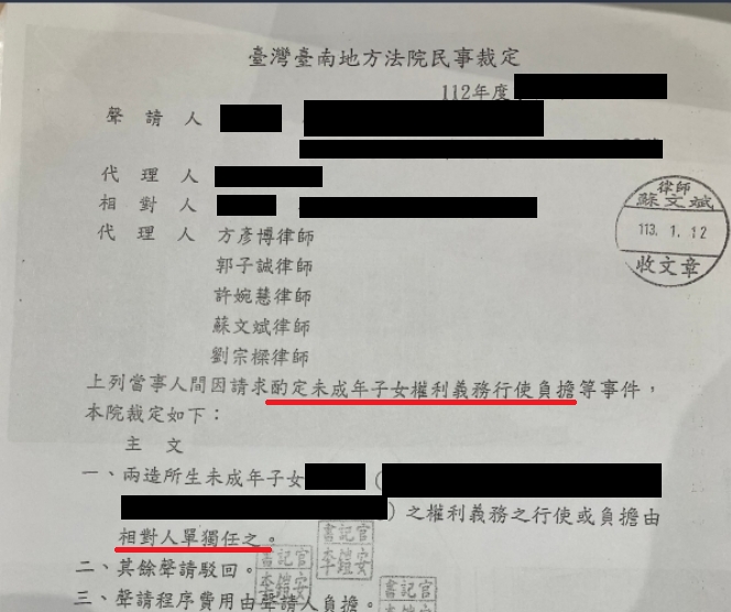 雖然本件當事人在多數方面都優於對造,蘇文斌律師團隊(我在法律事務所)也據此說服法院將孩子交給我造,最終,法院採納了我們的理由,將孩子的權利義務行使及負擔裁定由我們當事人單獨任之,但有相關實務經驗就知道,父親在爭取監護權案件中有多麼弱勢、多麼不容易,能為當事人得到有利的結果,是我們最欣慰的事。