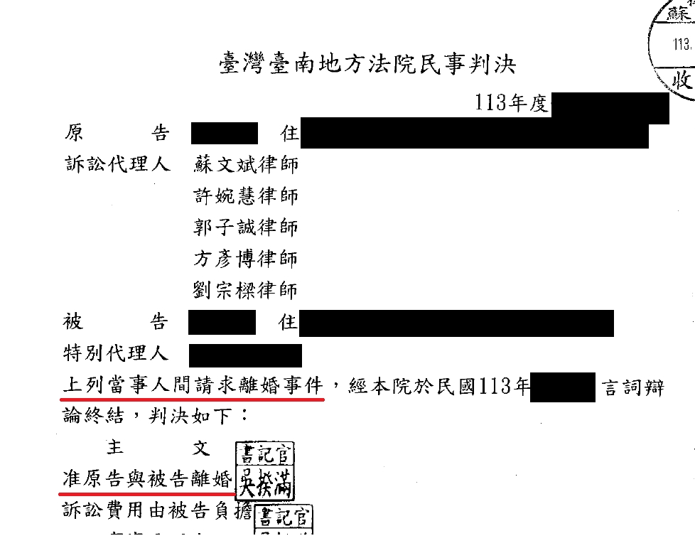 符合法定離婚事由時-協助當事人向法院訴請離婚獲准