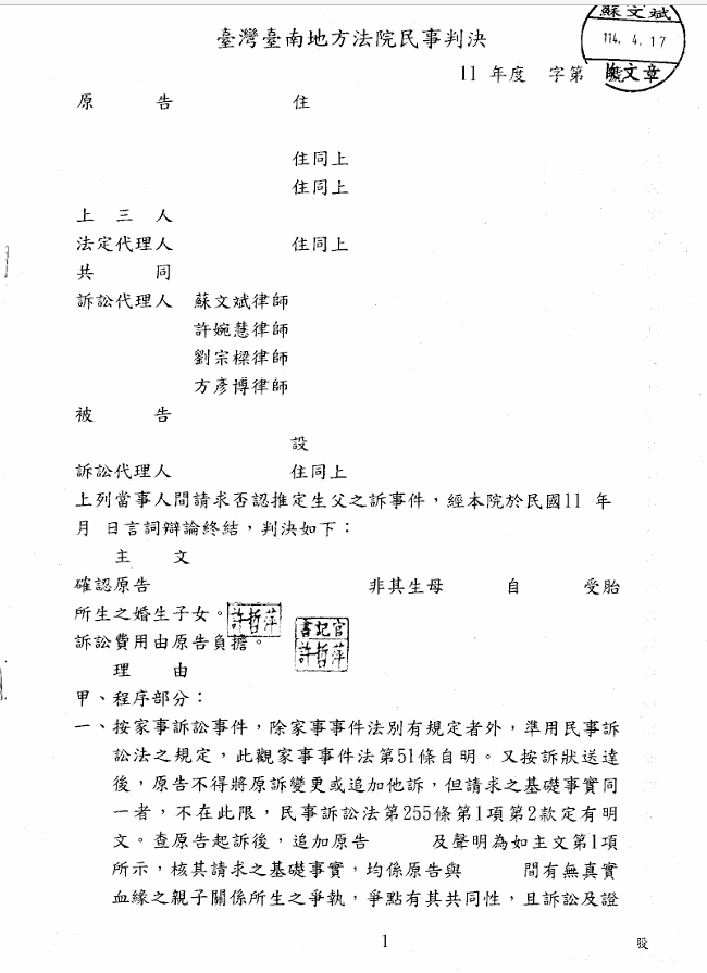 蘇文斌律師團隊(我在法律事務所)日前有一當事人前來求助,並表示其三名子女戶籍上所登載之父非其生父,但戶籍上所登載之父已死亡,臨死前,當事人答應該男將此三名子女之親子關係解銷,一方面了卻其心願,另一方面也避免後續繼承爭議,因此前來請託對家事案件相當嫻熟之蘇文斌律師團隊(我在法律事務所)協助處理本件。蘇文斌律師團隊(我在法律事務所)與當事人會談後,請求當事人提供DNA基因鑑定報告、戶籍謄本等相關資料,以便訴訟進行。蘇文斌律師團隊(我在法律事務所)起訴後提供鑑定報告並以訴狀解釋本案來龍去脈,最後,法院也宣判認定三名子女非該戶籍上所記載之父親所生的婚生子女,不僅讓三名子女回覆真實血緣,也完成當事人對該男之承諾。
