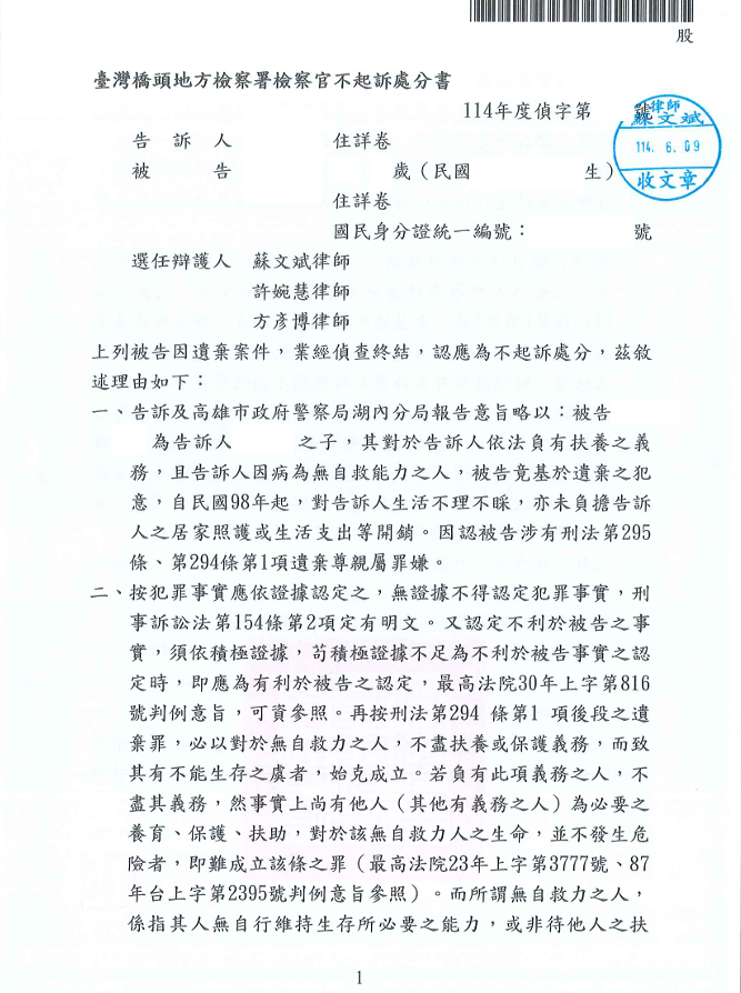 事實上,這位媽媽不但行動自如,生活上也有基本照顧,當事人也沒有「完全不理」,只是經濟壓力大,給的金額比較少罷了。這叫「有心無力」,不叫「遺棄」。我們幫當事人整理資料,並向檢察官說明實情,強調他雖然不是模範兒子,但也不是冷血兒子。最終,檢察官也接受我們的說法,認為本案並不構成遺棄罪,不予起訴,當事人總算放下心中一塊大石。