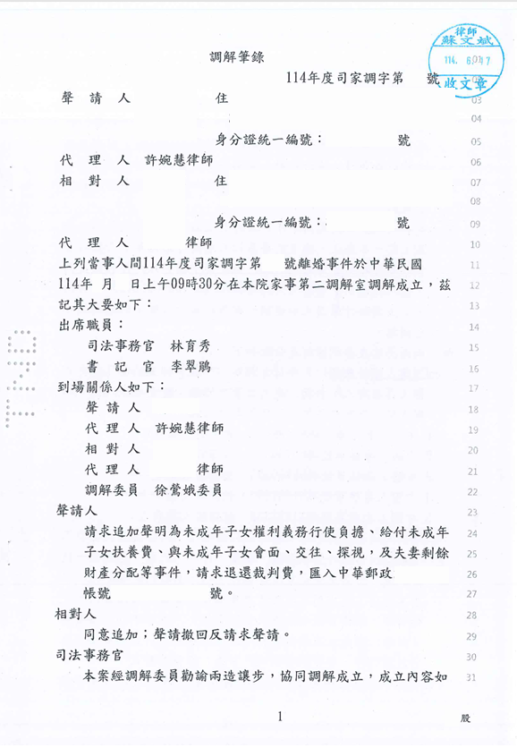 蘇文斌律師團隊(我在法律事務所)一邊安撫她的情緒,一邊協助她與對方確認財產、扶養費用、親權安排與會面交往的細節,保障她未來仍然能參與孩子的成長。經過幾次協調與雙方冷靜討論後,雙方簽下和解協議,結束了這段婚姻糾紛。